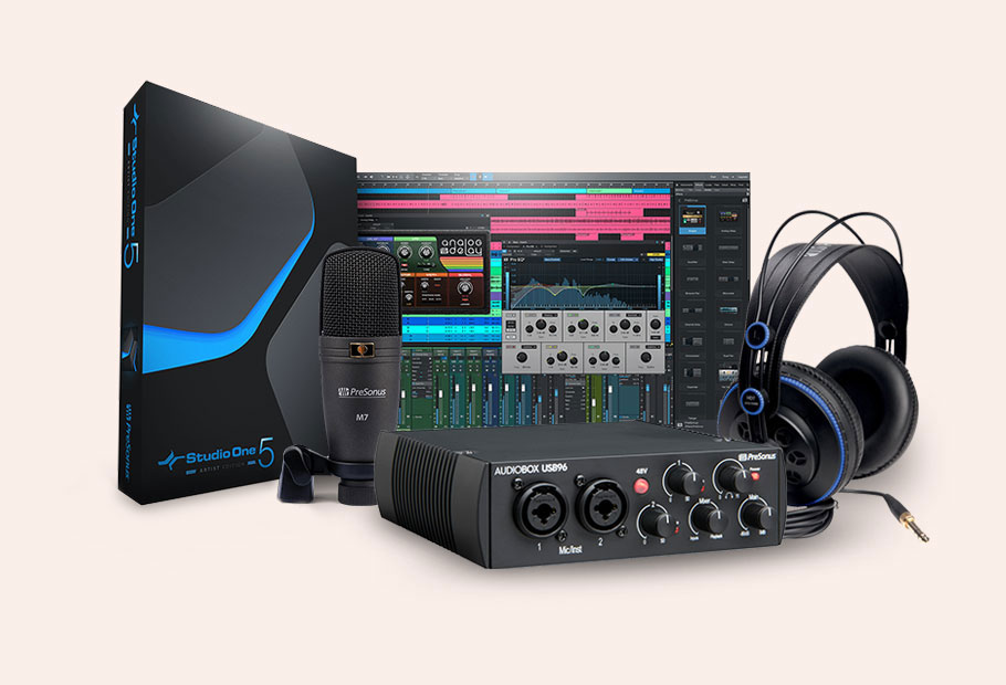 پکیج PreSonus AudioBox 96 Studio حاوی تمام ابزارهایی است که شما برای خلق کردن موزیک های خوش صدا نیاز دارید. میکروفن کاندنسر دیافراگم-بزرگ M7 پاسخگویی فرکانسی عالی از 40Hz تا 18kHz و تحمل فشار صوتی 136dB SPL دارد و برای ضبط وکال، گیتار آکوستیک و بسیاری سازهای دیگر فوق العاده است. قطعا اگر نتوانید صدای ضبط هایتان را به خوبی بشنوید این میکروفن اهمیتی نخواهد داشت. به همین دلیل است که کمپانی پریسونس هدفون مانیتورینگ HD7 را هم در این پکیج قرار داده است. این هدفون دارای درایورهای نئودیمیومی با رزولوشن بالا و یک چمبر آکوستیک می باشد که با دقت بالایی تیون شده و صدایی حرفه ای را ایجاد می کند. این هدفون سبک همچنین دارای پاسخگویی بیس عمیقی می باشد تا شما بتوانید در حین میکس تصمیم های هوشمندانه ای بگیرید.